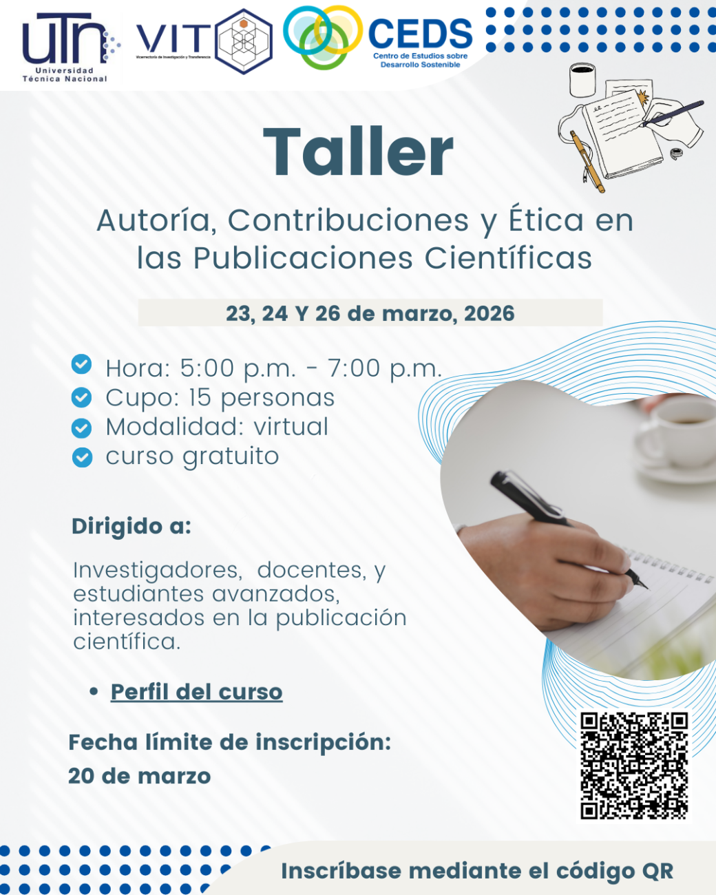 La Vicerrectoría de Investigación y Transferencia y el Centro de Estudios sobre Desarrollo Sostenible (CEDS) de la Universidad Técnica Nacional invitan cordialmente al taller “Autoría, Contribuciones y Ética en las Publicaciones Científicas”, el cual será impartido por la M.Sc. Melissa Camacho y la Dra. Gabriela Montes del Oca, del CEDS.