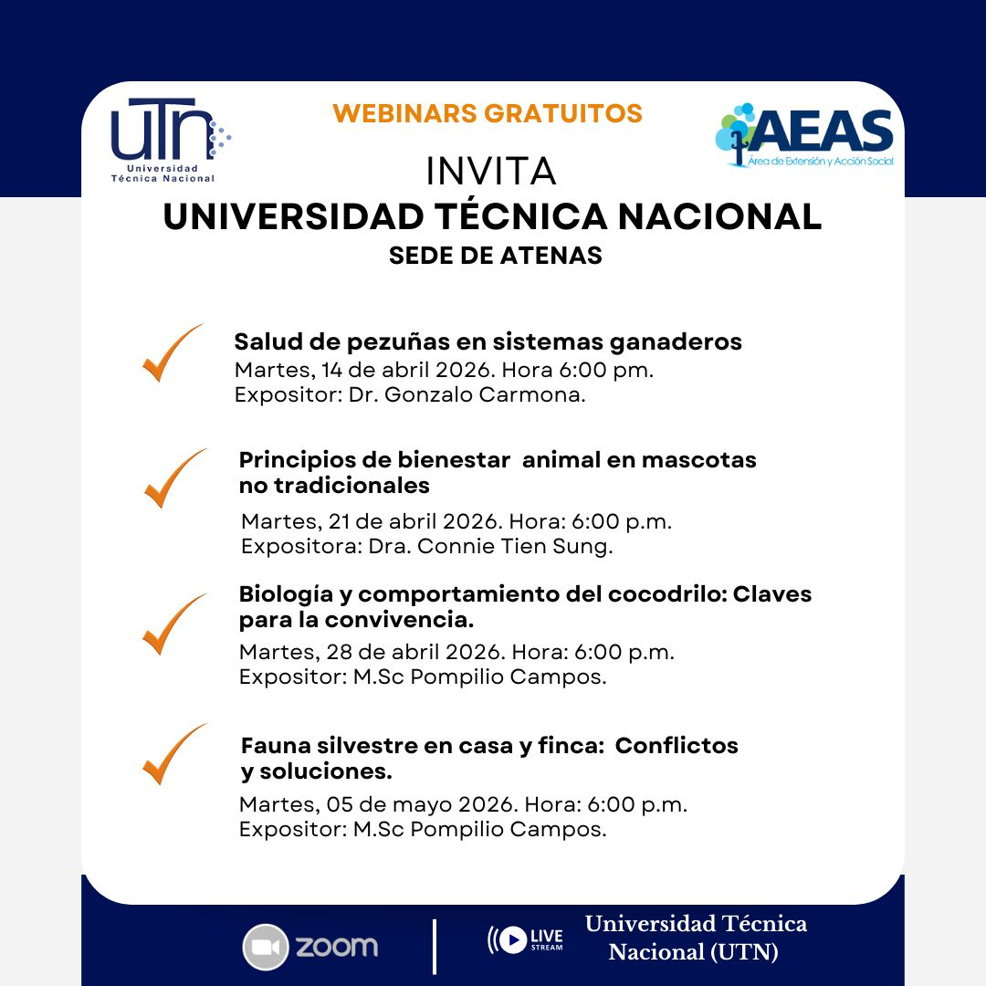 El Área de Extensión y Acción Social de la Sede de Atenas de la Universidad Técnica Nacional, le invita a participar en una serie de webinars gratuitos, orientados a brindar conocimientos sobre bienestar animal y convivencia responsable, con el propósito de fortalecer la prevención y el manejo adecuado de situaciones en diversos entornos.