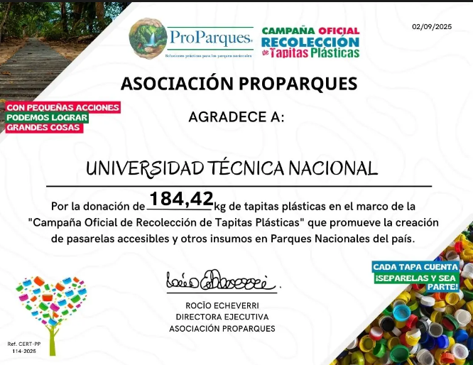 El pasado 1 de septiembre de 2025, el Grupo de Liderazgo de la Sede Central, junto con la coordinación de Gestión Ambiental Institucional, entregaron 184,42 kilogramos de tapitas plásticas a la Asociación ProParques, en el marco de la campaña nacional “Recolección de Tapitas ProParques”.