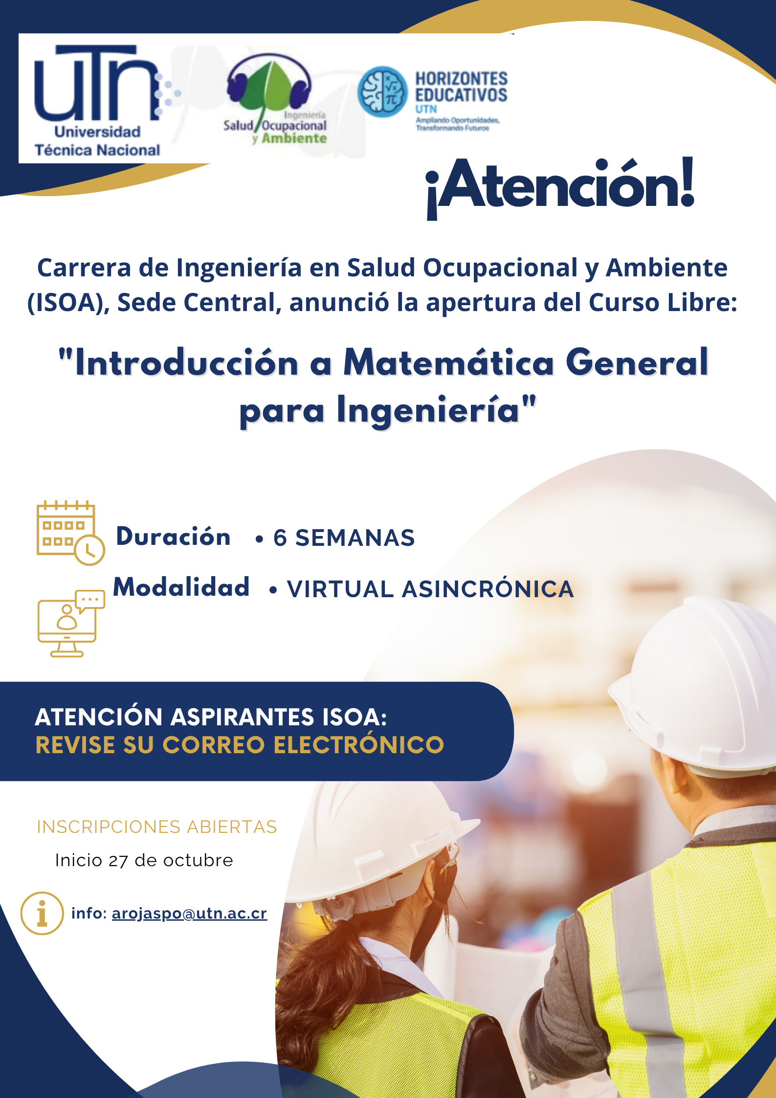 La Universidad Técnica Nacional (UTN), a través de la Carrera de Ingeniería en Salud Ocupacional y Ambiente (ISOA), en la Sede Central, anuncia la apertura del Curso Libre “Fortalecimiento en Matemáticas para Ingeniería”, una iniciativa que busca apoyar a las personas aspirantes a ingresar a la universidad en su preparación para enfrentar los retos académicos de una carrera de ingeniería.